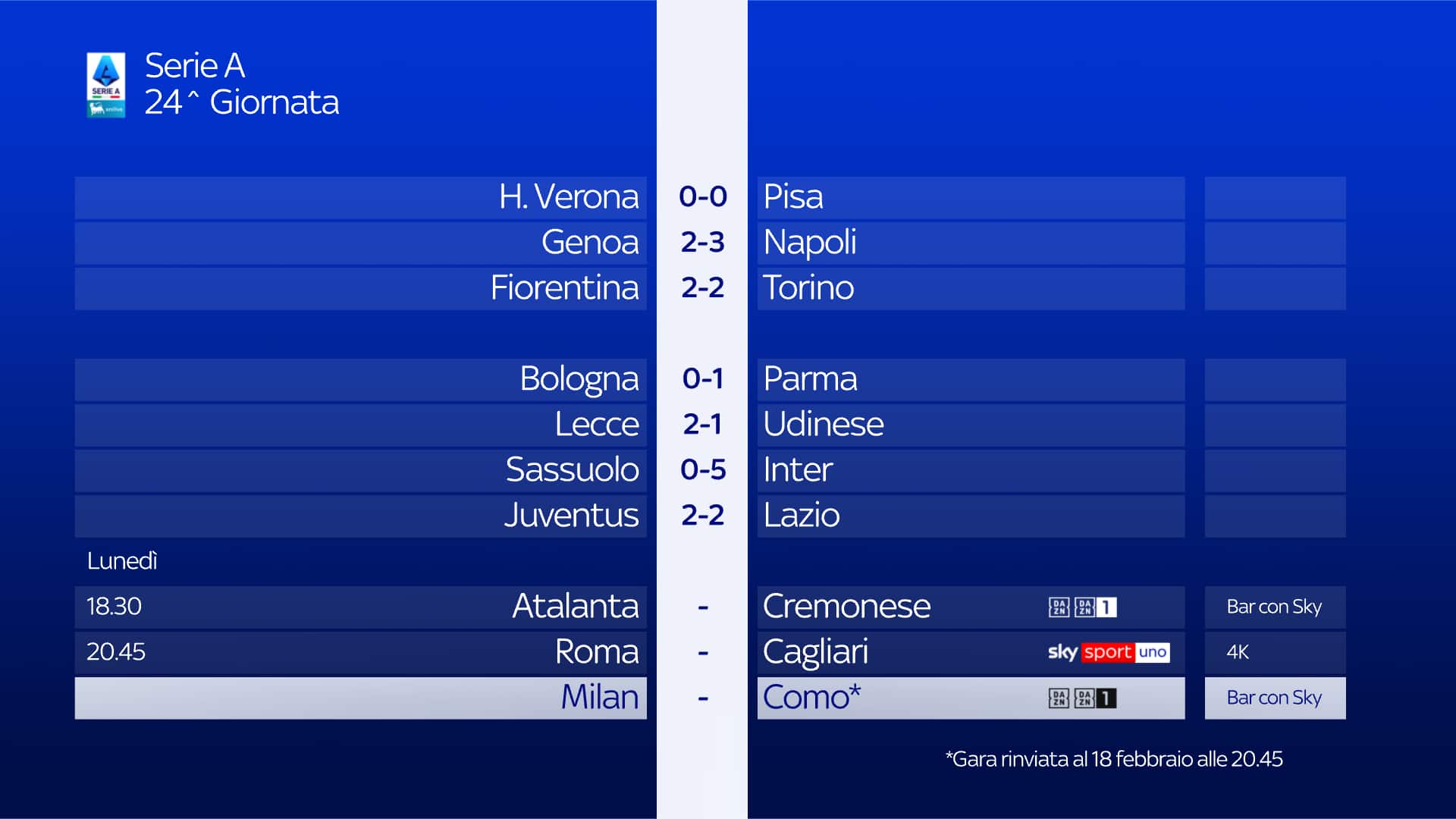 La partita Roma-Cagliari, valida per la 24^ giornata di Serie A sarà trasmessa lunedì 9 febbraio alle ore 20.45 e sarà in diretta su Sky Sport Uno, Sky Sport Calcio, Sky Sport 4K, Sky Sport 251 e in streaming su NOW. Telecronaca Riccardo Gentile, commento Lorenzo Minotti. A bordocampo Paolo Assogna e Angelo Mangiante. Appuntamento con L’Originale, dalle 20.00 alle 20.35 e dalle 22.45 a mezzanotte. In studio Alessandro Bonan in compagnia di Veronica Baldaccini, Gianluca Di Marzio, Luca Gotti, Gianfranco Teotino, Fabio Quagliarella.